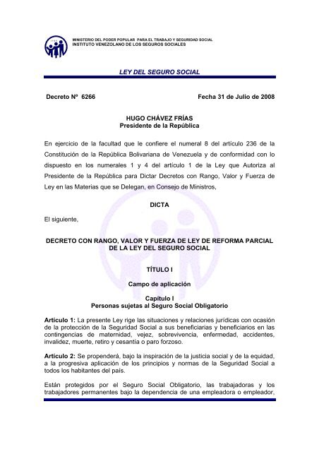 Ley Del Seguro Social Decreto NΒΊ 6266 Fecha 31 De Julio De